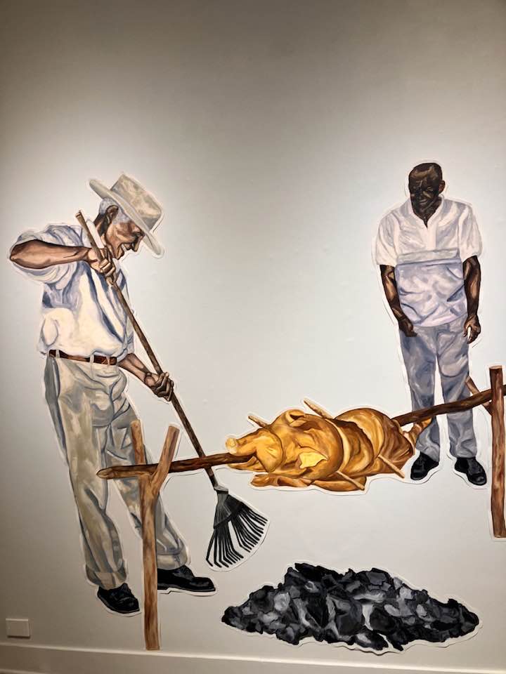 The painting directly below was painted by Puerto Rican artist Alberto Alonso. He depicts the impossibility of homesickness and nostalgia born from the impossibility of returning to his home of a Puerto Rico transformed by time, disaster, and human-driven change, added the UCF website.